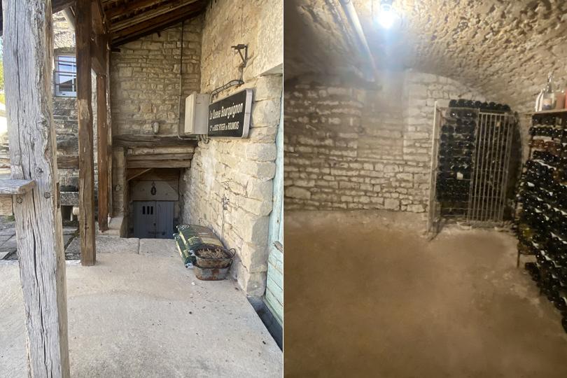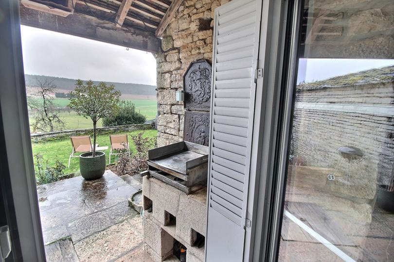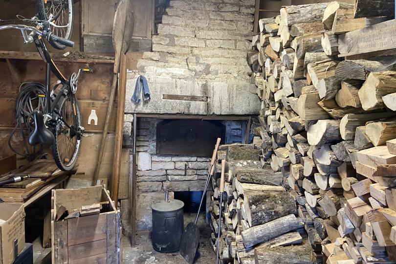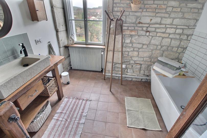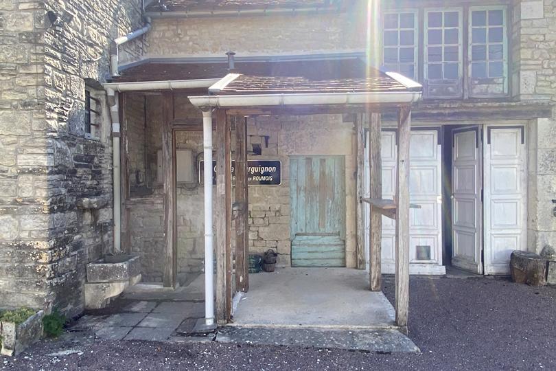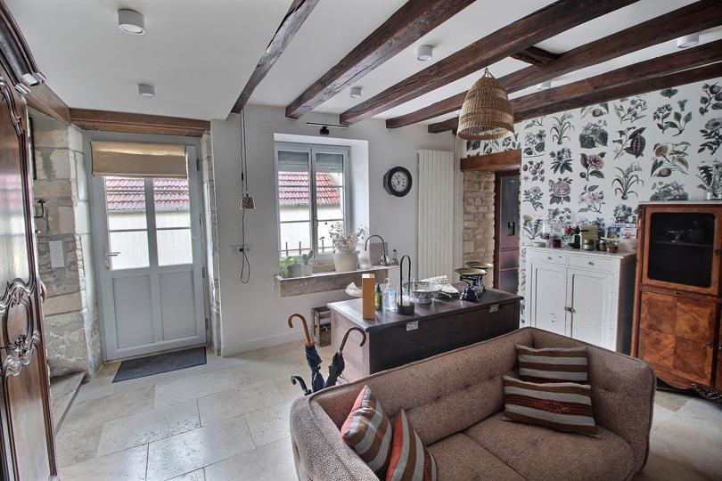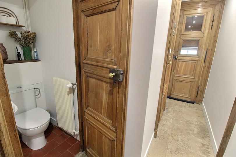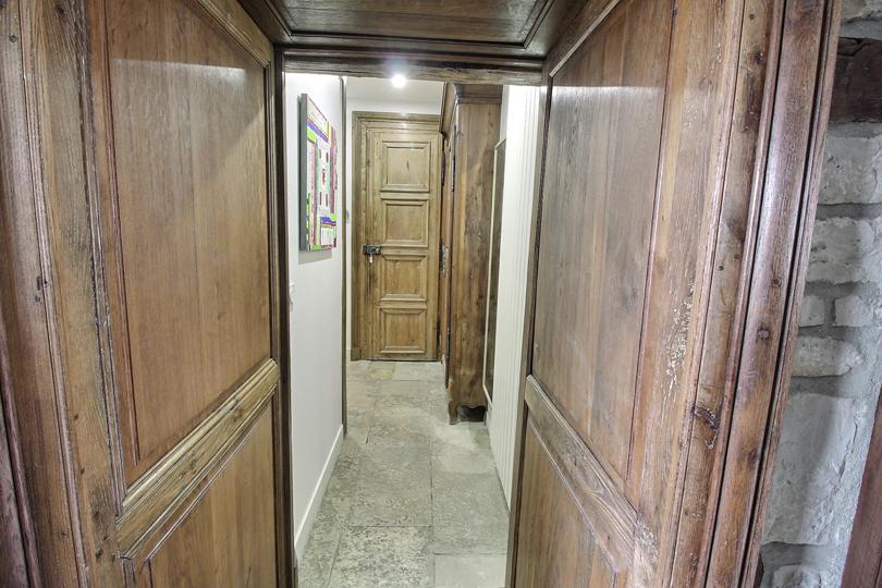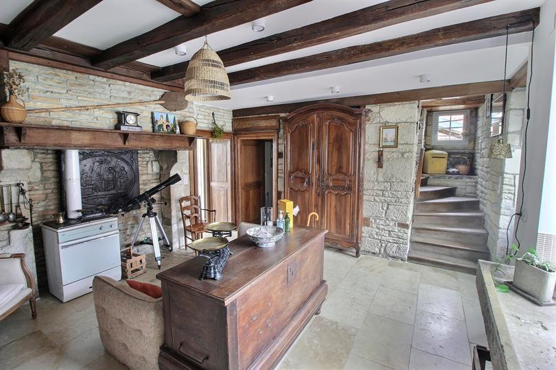 Hall d'entrée (également appelé "légumerie") avec vestiaire, cheminée et pierre à laver en pierre, avec sol en pierres de Bourgogne |